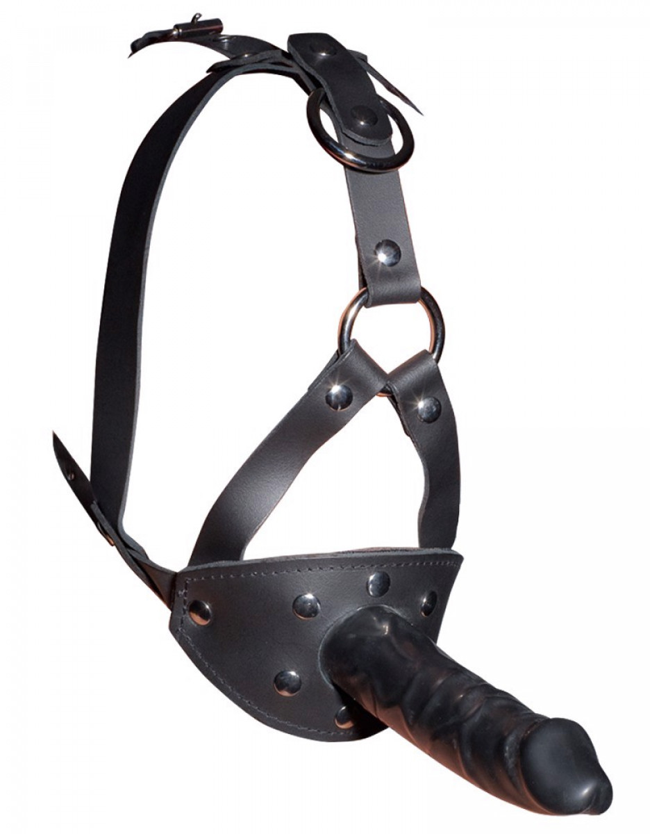 Az állítható, fekete fejpánt belsejében egy piros szájpecek (átmérője 3,5 cm), kívül pedig egy nagy dildó (13 cm hosszú, átmérője 3,5 cm) található, amely biztonságosan rögzítve van.