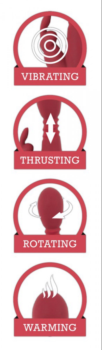 Ez a vörösen izzó nyúlvibrátor gyönyörű fekete díszítőelemekkel lángra lobbantja az öröm tüzét. A szár kiemelkedő stimuláló barázdákkal rendelkezik, és célzott hüvely- és G-pont stimulációt biztosít. A nyúl alakú csiklóstimulátor érzéki, rugalmas fülekkel van felszerelve. 10 rezgési móddal és 3 lökés/forgatás szinttel rendelkezik. A nyúlvibrátor szinte minden más szexuális játékszernél realisztikusabbnak érződik a 42°C-ig melegítő funkciónak köszönhetően. Vízálló és a mellékelt USB-kábellel tölthető.
